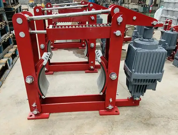 起重机起升机构中多用长行程电磁铁制动器或液压电磁铁制动器,在运行机构中多用短行程电磁铁制动器或液压推杆制动器。 这几种制动器是靠主弹簧的做用力,通过制动臂使制动带对称地抱在制动轮上。制动带与制动轮的接触面积不应小于制动带面积的75%。各种制动器上的尺寸是主弹簧在正常情况下能发出额定制动力矩的长度。